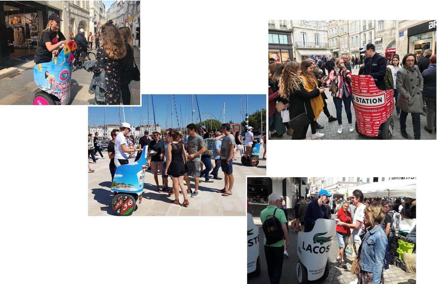 De l’importance de créer du lien avec vos futurs clients. Que ce soit avec l’une de nos formules comme la Roue de la Chance, Jour de Match ou Duo, le street marketing à Segway crée systématiquement une interactivité avec les passants, toute génération confondue. Le capital sympathie est énorme et permet de toucher plus facilement les gens. Le street marketing à Segway ce n’est pas seulement un gyropode avec un affichage publicitaire. C’est aussi une équipe formée et habituée à interagir avec le public. Des animateurs, femmes et hommes, qui vont aller au contact des passants et sauront les motiver. Enfin, nos animateurs sont aussi vos meilleurs ambassadeurs auprès du public.