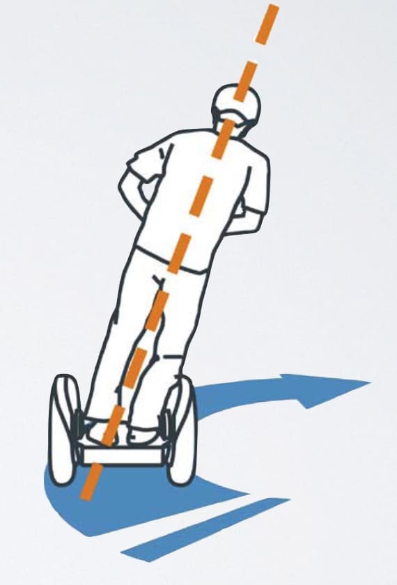 So, if you want to go faster, you just lean farther forward. To slow down, you have to lean back. To change direction or turn, the maneuver is the same as with any two-wheel vehicle: you just have to turn the steering wheel right or left, depending on where you want to go.