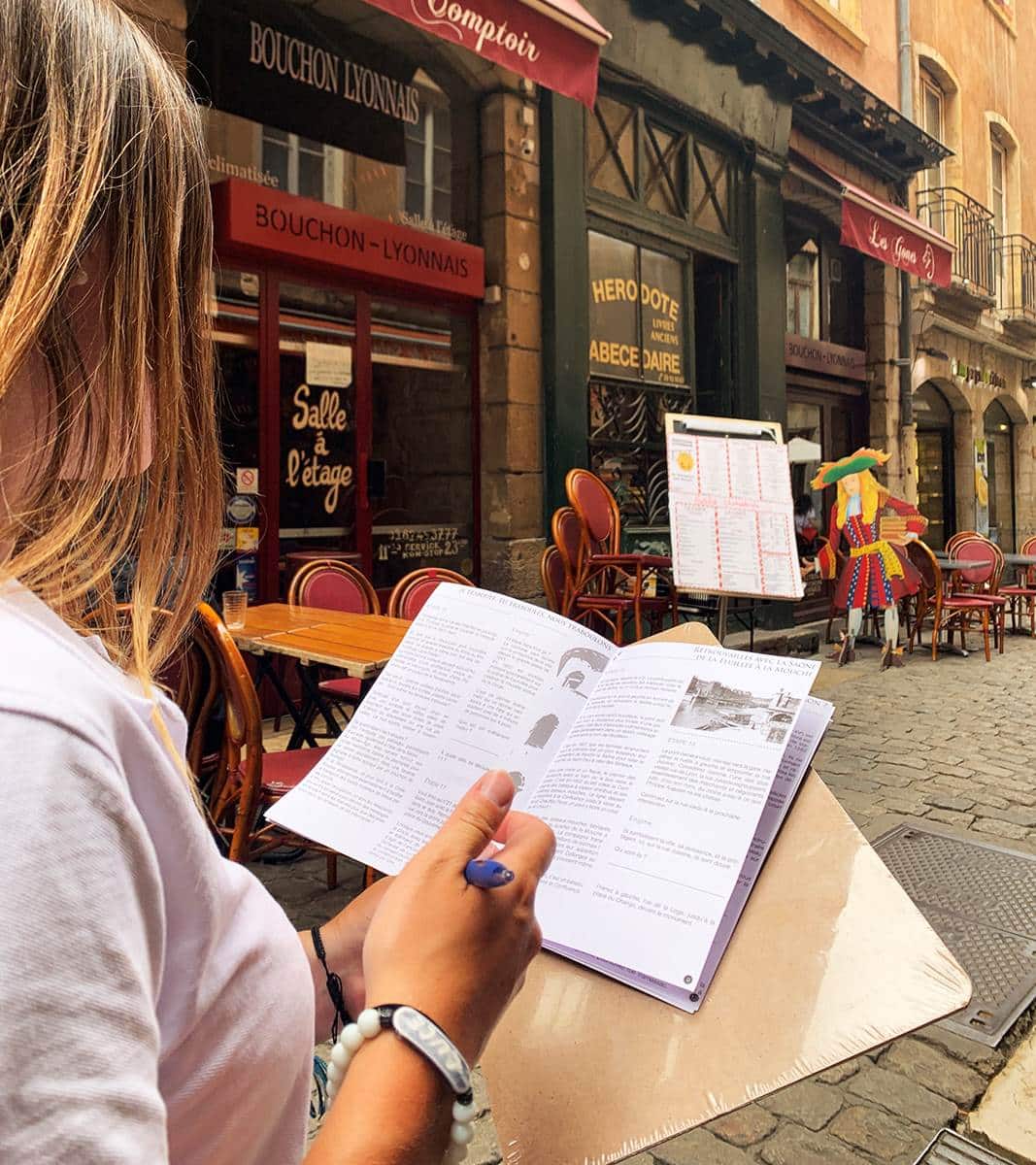On vous remet votre carnet de jeu, quelques explications et hop, c’est parti pour l’aventure dans les rues de Lyon. Ici, par de timing. Vous pouvez vous arrêter prendre un café ou une gourmandise au passage et reprendre le jeu et l’exploration comme bon vous semble.