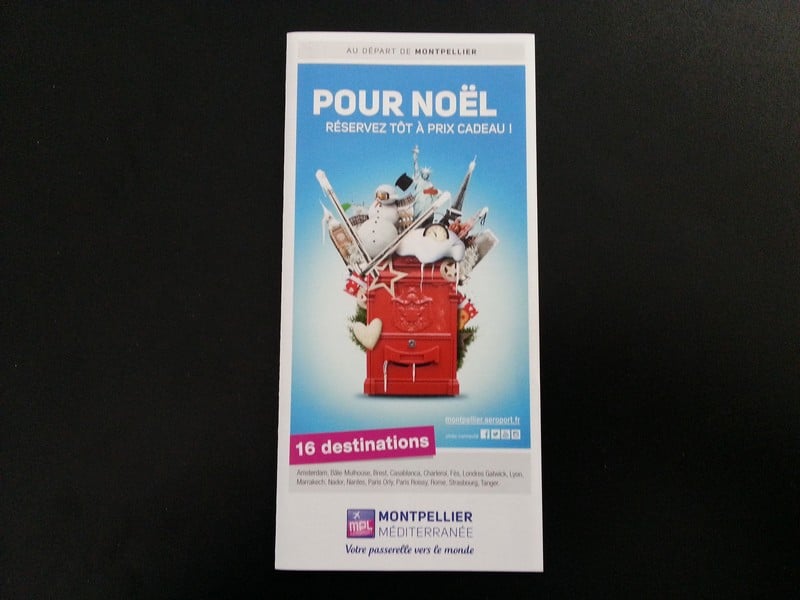 Le service communication de l’aéroport voulait mettre en avant toutes les destinations au départ de Montpellier. Le slogan était « POUR NOEL, RESERVEZ TOT A PRIX CADEAU ». En d’autres termes il s’agissait de permettre à la clientèle de l’aéroport de prévoir ses déplacements de fêtes de fin d’année, à prix serré.