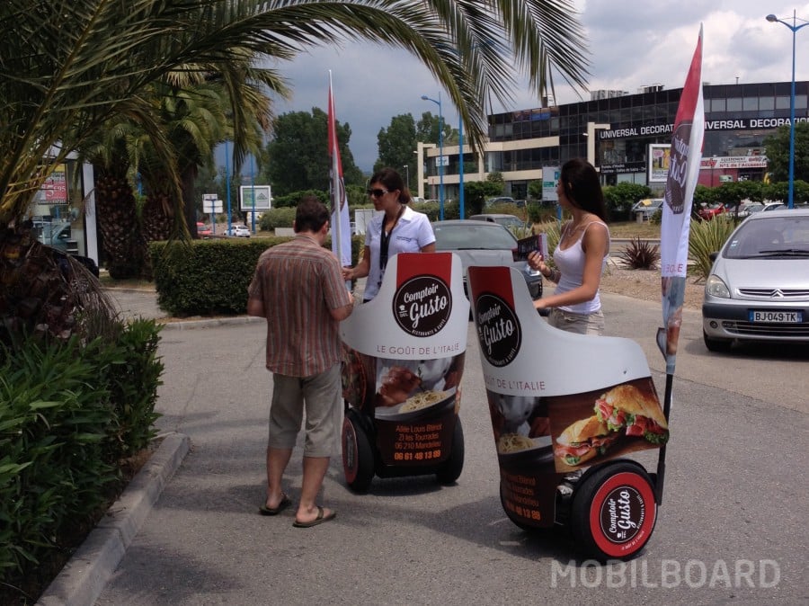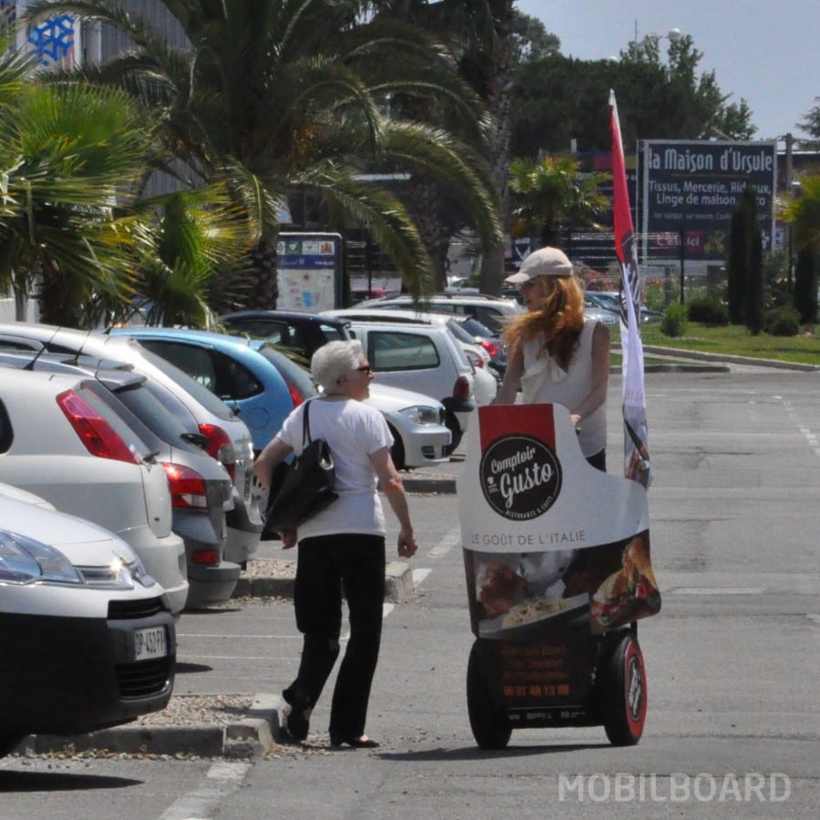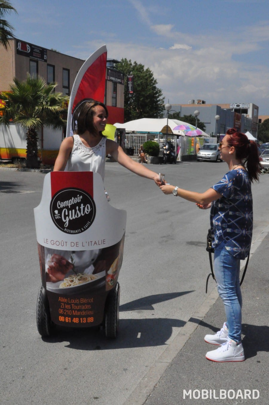 Dans le cadre de l’ouverture de son restaurant à Cannes-Mandelieu, Comptoir Del Gusto a fait appel à Mobilboard. Le but : distribuer des flyers annonçant l’ouverture du restaurant et proposer une offre promotionnelle.