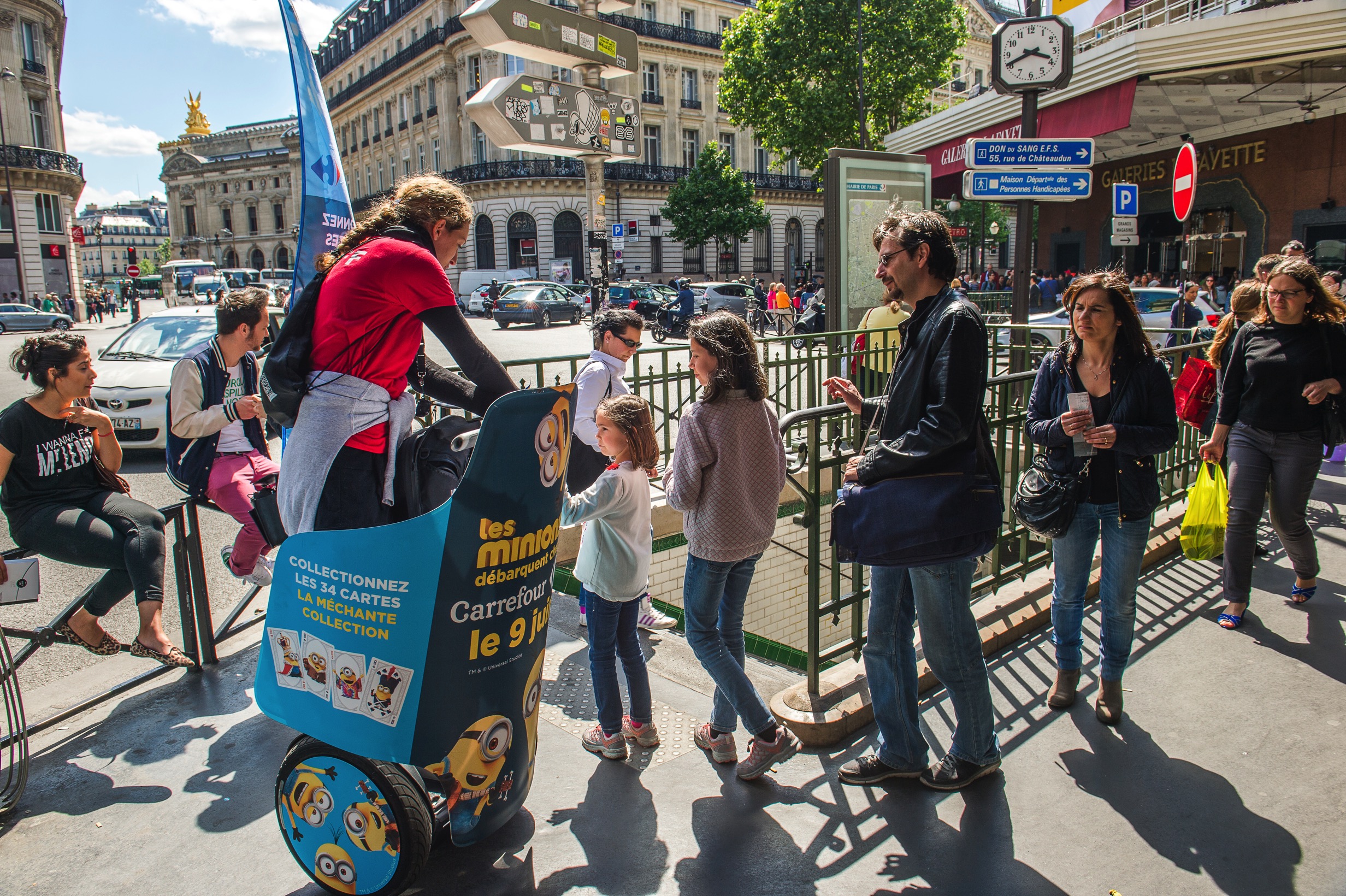 Tout d’abord, Universal Pictures et les hypermarchés Carrefour ont mis en place une campagne de communication événementielle pour accompagner la sortie du film « Les Minions ». Ainsi, l’agence Evasion Communication a fait appel au réseau Mobilboard. Le leader sur le secteur du street marketing avec 60 points logistiques et spécialiste du gyropode Segway. Aussi, 6 villes (Nice, Marseille, Toulouse, Bordeaux, Lyon, et Paris) avaient été choisies pour annoncer la sortie d’un jeu de cartes Les Minions dans les magasins Carrefour.