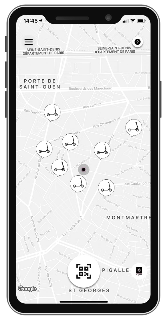 De la même manière que pour les plateformes que vous connaissez, vous pourrez facilement localiser la station et les trottinettes disponibles sur la carte de l’application mobile.